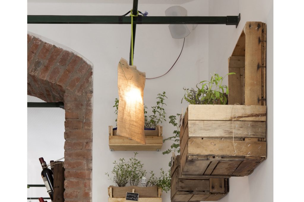 E lo styling del locale? è eco-friendly, naturalmente! Non mancano le piantine aromatiche che creano fresche quinte verdi nello spazio outdoor. Nella sala interna, molto luminosa, tavoli e sedie sono in legno di recupero, mentre delle vecchie cassette appese alle pareti diventano una sorta di cachepot per il green verticale.