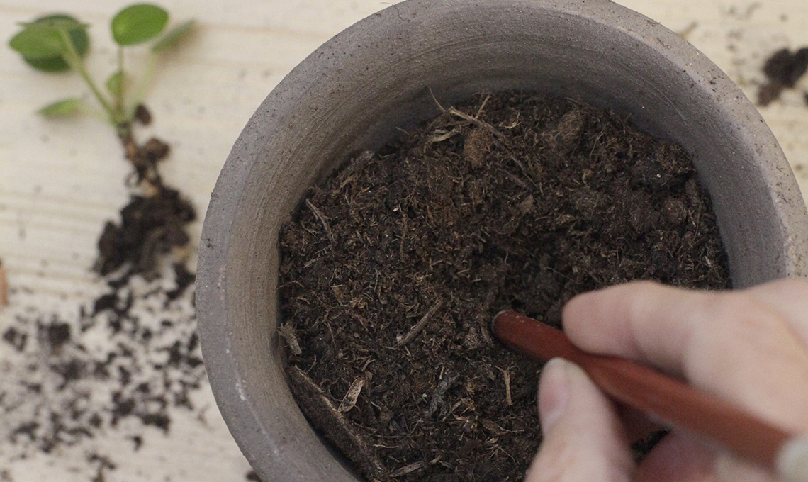 - Con una matita fai un foro nella terra e inserisci la baby pilea, quindi bagna la terra con un vaporizzatore e metti il vaso in un luogo luminoso.