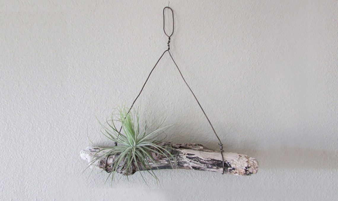 Procurati dei fili in nylon da pesca e fissali al soffitto con dei ganci a uncino (vedi il disegno sopra a destra). Prendi dei piccoli supporti in legno a forma di disco (o dei pezzi di corteccia, che legherai all’altra estremità del filo. Infine ‘fissa’ la pianta al legno con un elastico, senza usare colle. In alternativa, puoi metterle adagiate sul davanzale, oppure appese nel vano doccia.