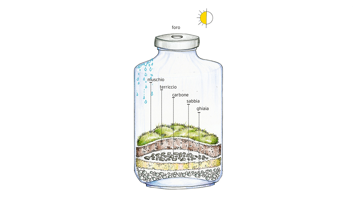 Hai presente il ciclo dell’acqua? All’interno della bolla in vetro la luce solare è ancora in grado di penetrare nella vegetazione provocando l’evaporazione dell’acqua. La condensa che si forma risale lungo le pareti interne e ricade, sotto forma di gocce, sul muschio rendendo autosufficiente questo micro ecosistema. Puoi acquistare il mossarium già fatto oppure realizzarlo con i nostri consigli.