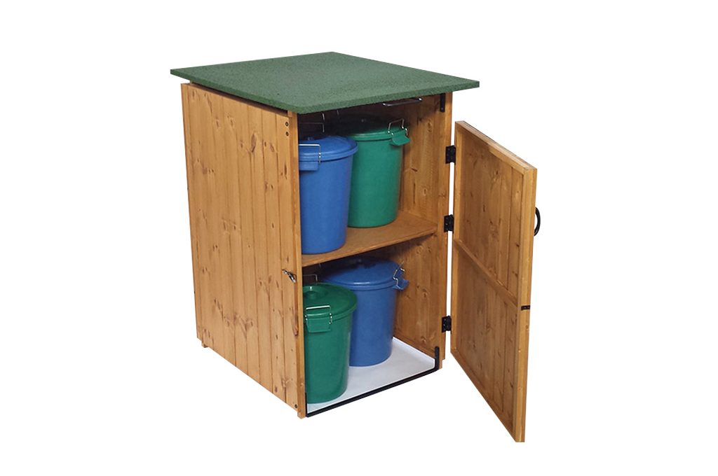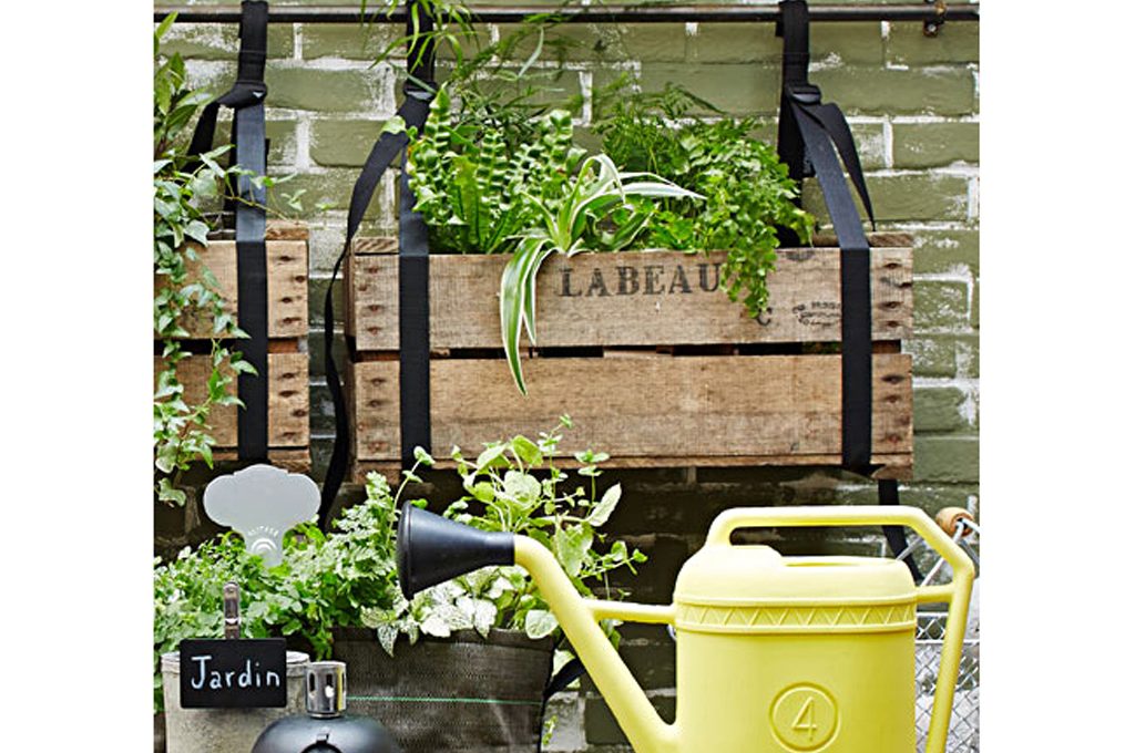 Accanto alla parete con le perline grigie, per creare più privacy, metti tre betulle in tre grossi vasi. Sopra il vano ripostiglio inserisci delle balconette ricolme di piante stagionali ricadenti (Verbene e Petunie viola).
