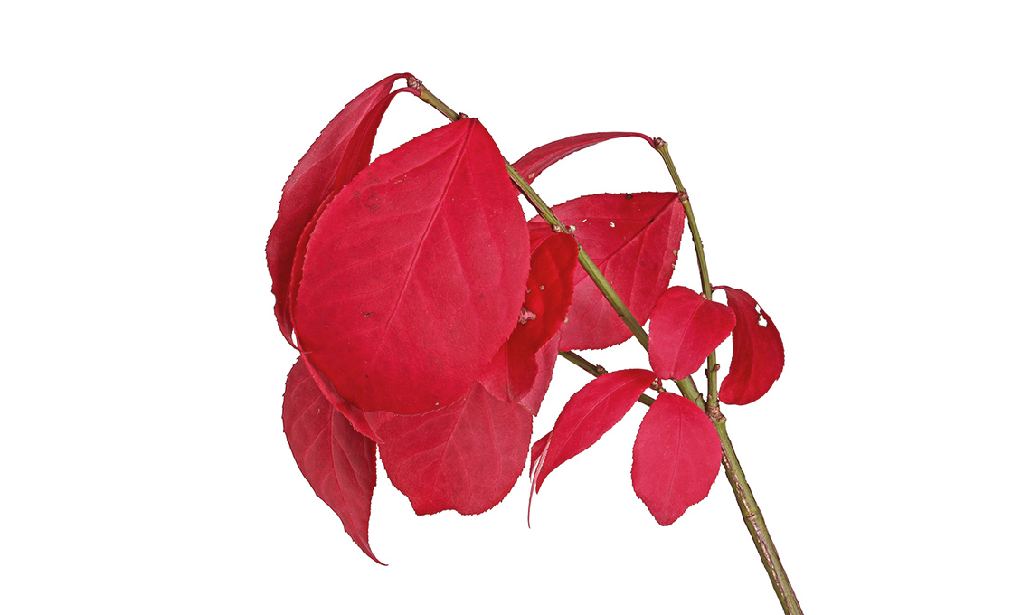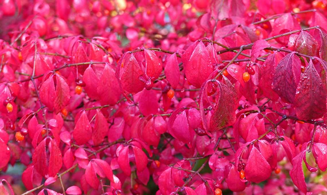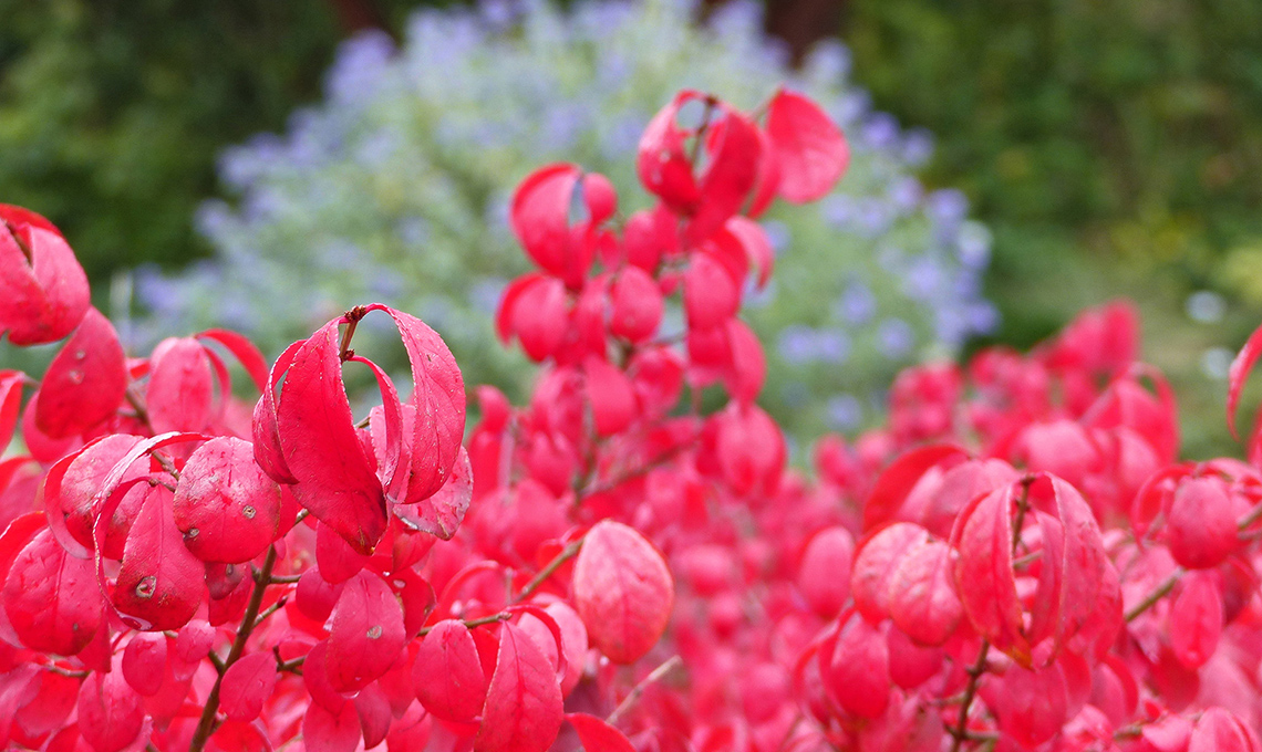 Euonymus alatus ‘Compactus’: gli inglesi lo chiamano Burning Bush (roveto ardente), perché da ottobre le foglie dell’Evonimo alato, nativo della Cina centro-settentrionale, del Giappone e della Corea, sembrano prendere fuoco per alcune settimane, diventando di un bel rosso cremisi.