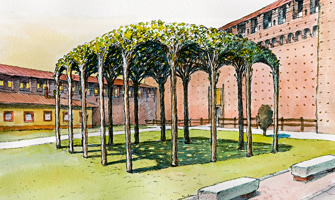 restauro – la pergola dei gelsi è stata ricreata nel cortile delle Armi del Castello Sforzesco, per celebrare il genio (anche green!) di Leonardo, di cui ricorre il 500°
