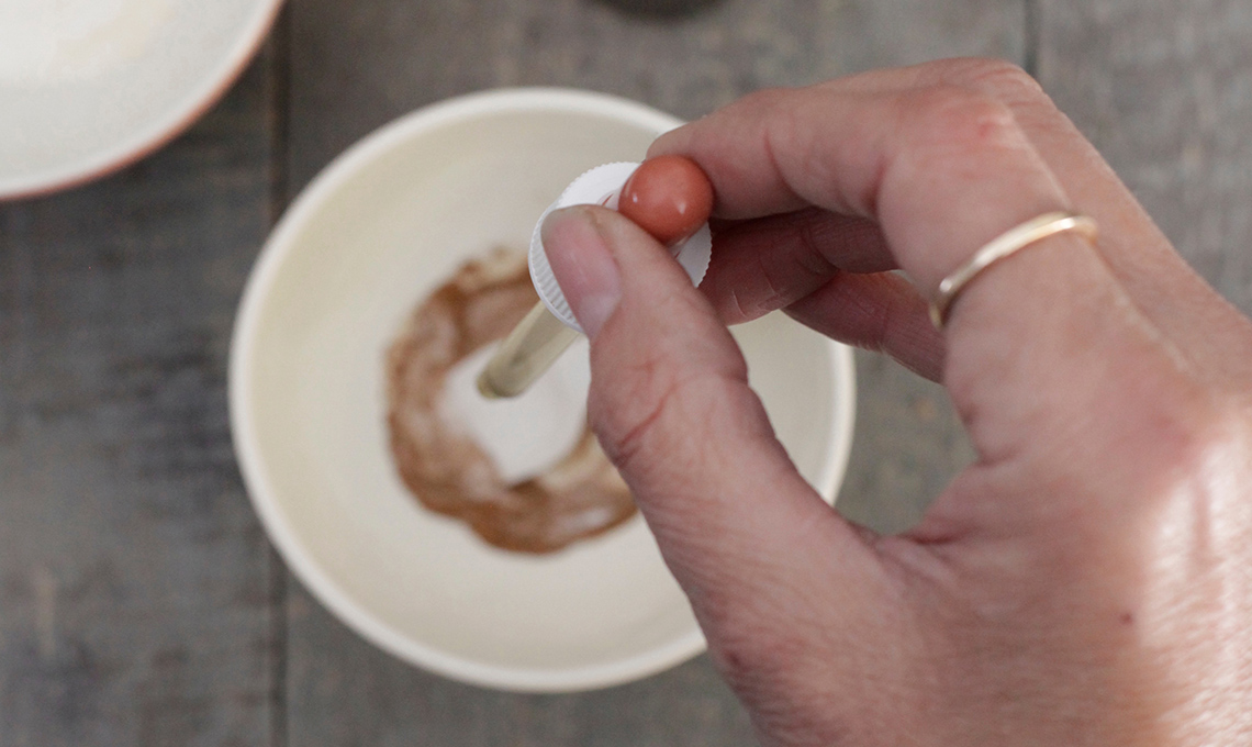 - In una ciotola mescola con le dita le spezie macinate, dosandole e scegliendole a seconda del tuo gusto. Aggiungi il fissativo e alcune gocce di olio essenziale, fai assorbire bene e lavora ancora con le dita per formare una mistura sabbiosa.