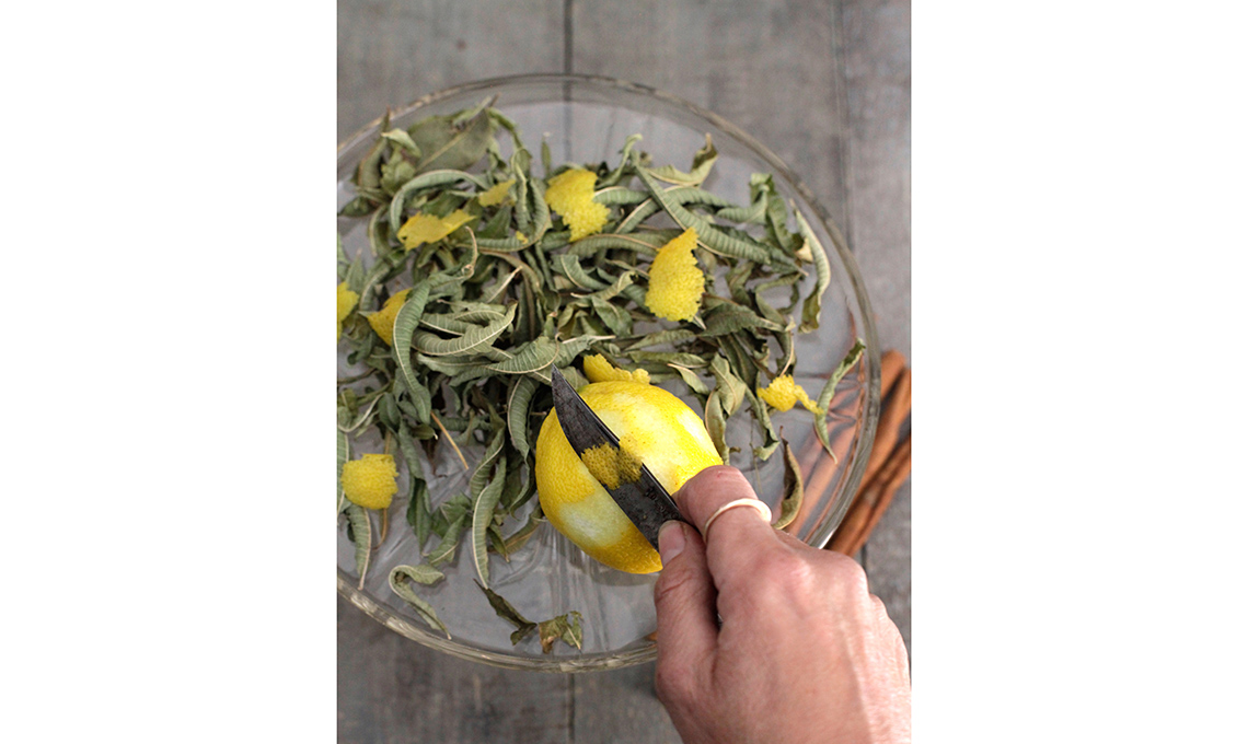 Per una miscela con base fresca e agrumata, usa la scorza del limone, aggiungi una nota di pepe rosa che offre anche colore, intensifica il sentore con la citronella (ovvero Lippia citriodora), ottima alleata anche contro le zanzare, da coltivare solo nei climi più caldi altrimenti da riparare durante l’inverno. Completa infine con le corolle e i petali delle rose più profumate del giardino.