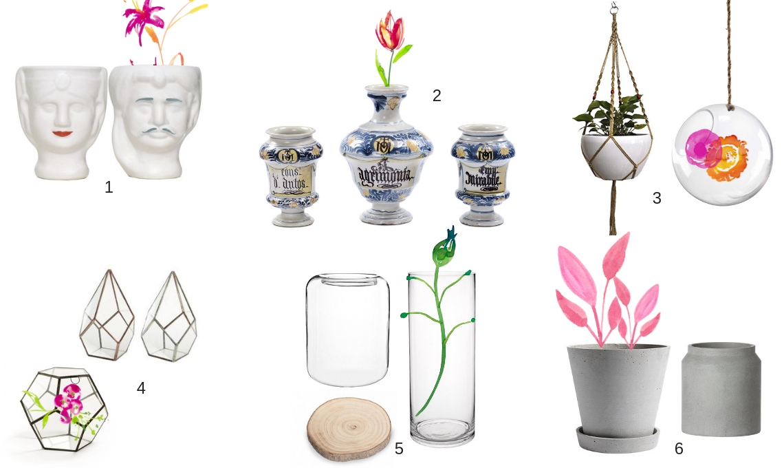 Le teste di Moro e Malandrina (1), vasi vintage da farmacia (2), vasi in macramè (3), terrari in rame (4), vasi in vetro con sottovaso ricavato da una sezione di tronco d’albero (5), vasi dai colori neutri, in polystone (6)