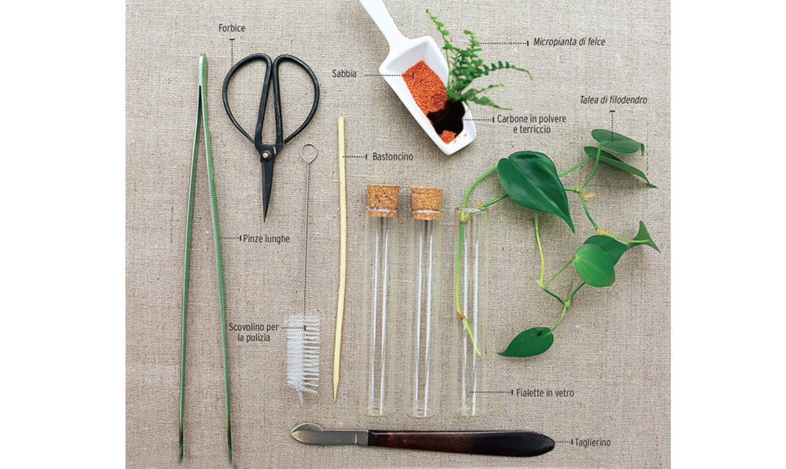 - Se fai il mini-terrario: metti sabbia, polvere di carbone e terriccio. Con la pinza, infila la piantina, bagna poco e chiudi.