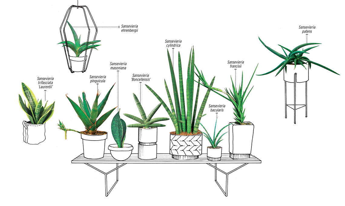 Esistono più di 60 specie di sansevieria, ecco quelle più interessanti. Possiamo dividerle in due gruppi: piante con foglie a colonna e lanceolate (S. cylindrica) e piante con foglie che si sviluppano a ‘rosetta’ (S. trifasciata ‘Laurentii’). In entrambi i casi le foglie nascono da un rizoma e crescono in verticale.