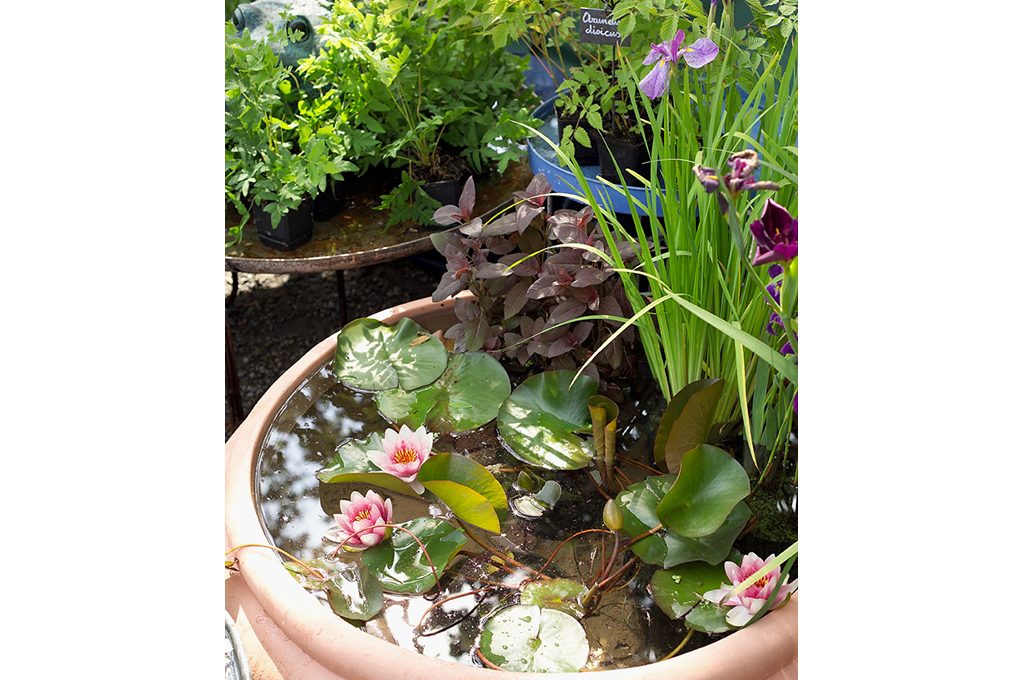 Per gli spazi ridotti le più adatte sono le acquatiche sommerse a foglia galleggiante: le piante appartenenti a questo gruppo sono molto simili alle ninfee hanno cioé un apparato rizomatoso o tuberoso radicato sul fondo, foglie e fiori galleggianti e più o meno emergenti dalla superficie. Appartengono a questo gruppo le seguenti specie e varietà: Aponogeton dystachyos, Euryale ferox, Hydrocleys nymphoides, Nuphar japonica, Nuphar lutea, Nuphar lutea "Macrophylla, Nuphar lutea "Sagittifolia, Nuphar pumila "Variegata", Nymphoides peltata, Trapa natans. Vista la dimensione del bacino, ti consigliamo di non mettere più di due specie alla volta nello stesso contenitore.