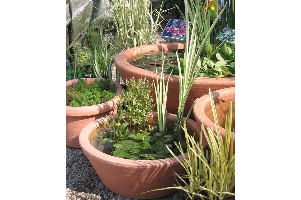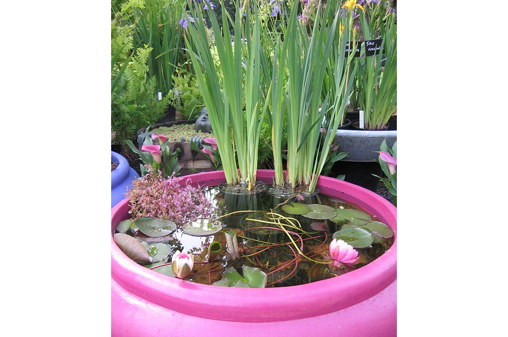 Deve essere a tenuta stagna e non deve ossidare. In commercio trovi dei vasi in metacrilato colorato dalle forme più stravaganti ma puoi utilizzare anche dei vecchi secchi o tinozze da giardino in metallo zincato oppure delle giare di terracotta smaltata. Per le dimensioni chiedi consiglio al giardiniere che ti venderà le piante. Posizionalo in un punto perfettamente in piano.