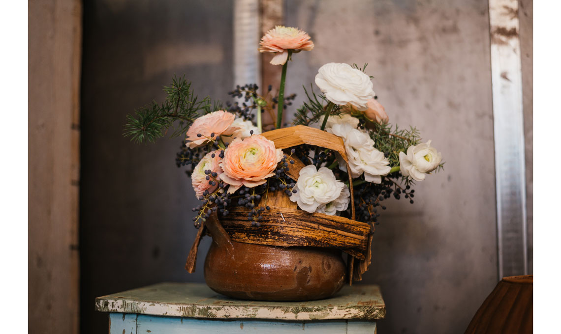 La mia proposta, per questo mese, oltre che la bellezza dei fiori, vuole portare in casa il colore della terra. Per questo ho scelto un vecchio contenitore in terracotta, come quelli che spesso abbiamo nascosti in cantina o soffitta, su cui ho costruito una struttura con le foglie essiccate di banano, che mi sono piaciute per il colore e la loro duttilità. Le puoi comprare da un fiorista, in un garden center o anche on line. Basta piegarle e plasmarle con le mani per ottenere la forma desiderata, e poi fissarle con una pinzatrice. Come fiori ho scelto solo due tipi di ranuncoli dai colori molto tenui, alcuni rametti di ginepro, delle bacche nere di ligustrum e qualche rametto di pino mugo.