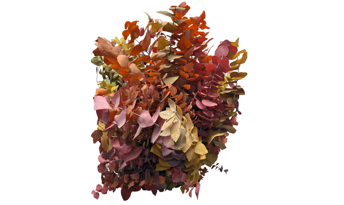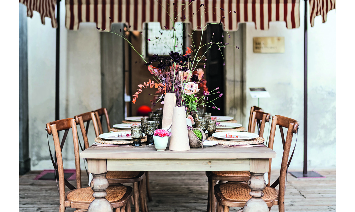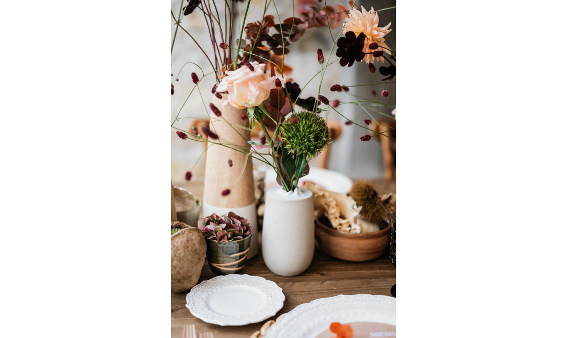 La palette va dai bianchi panna delle radici e dei piatti, alle sfumature di terracotta dell’eucalipto, di contenitori e sottopiatti, fino al marrone dei ricci e dei portasemi. Un tocco di fresco è aggiunto dal verde dei garofani 'Green Trick', e dall’azzurro delle piccole candele. Infine, un accento di nero dato dai candelabri artigianali, che vira – con la parte floreale – tra gli aranci bruciati dell’eucalipto e dei garofani, il pesca delle rose e il bordeaux della sanguisorba. Tocco stiloso e inaspettato, le posate in rame!