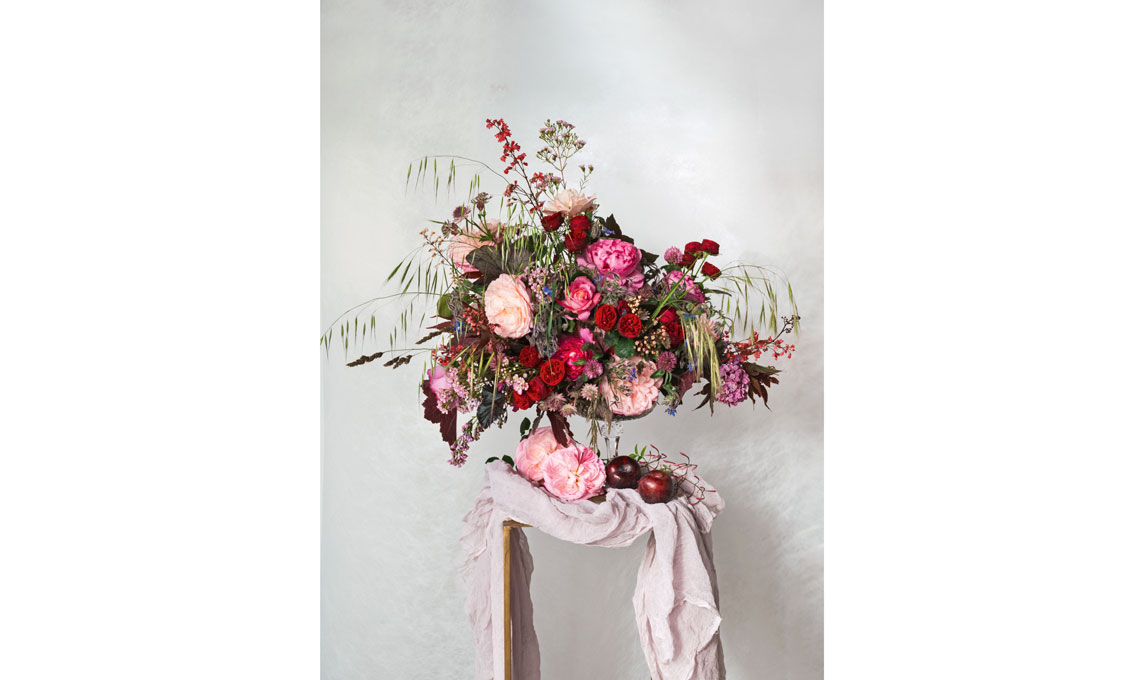 Questo mese ho puntato tutto sulla regina dei fiori, la rosa. E queste sono tutte rubate dal mio piccolo giardino, mentre i ‘filler’ (i piccoli fiorellini di riempimento) li ho raccolti facendo due passi fuori casa. La composizione è stata realizzata con una tecnica sostenibile, senza la spugna da fioristi. Ho utilizzato la rete metallica in un’alzatina di vetro trasparente, con una coppa piccola, per far risaltare la composizione nella sua maestosità ma senza pesantezza. L’idea è nata prendendo spunto dai meravigliosi dipinti floreali degli antichi pittori olandesi.