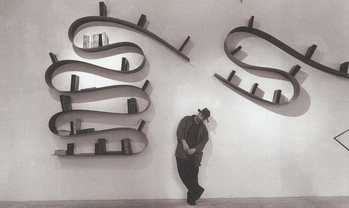 «Mi piace fare cose mai accadute prima». E infatti Bookworm esce proprio da una scatola arrotolata! Reinventare la libreria, un arredo da sempre ortogonale: Ron Arad l’aveva immaginata lavorando con il metallo, sfidando come suo solito le leggi fisiche del materiale.