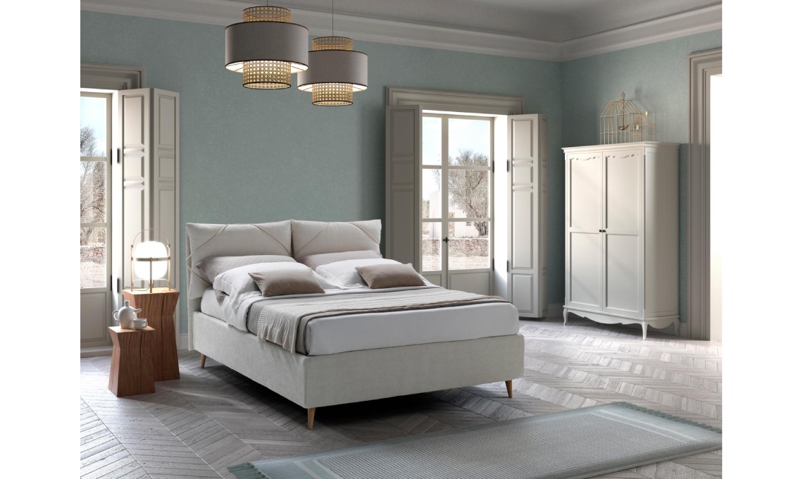 Non solo: è totalmente e facilmente sfoderabile per cambiarne l’aspetto con le stagioni; e quando la tv dal salotto arriva in camera, la testata si reclina leggermente.