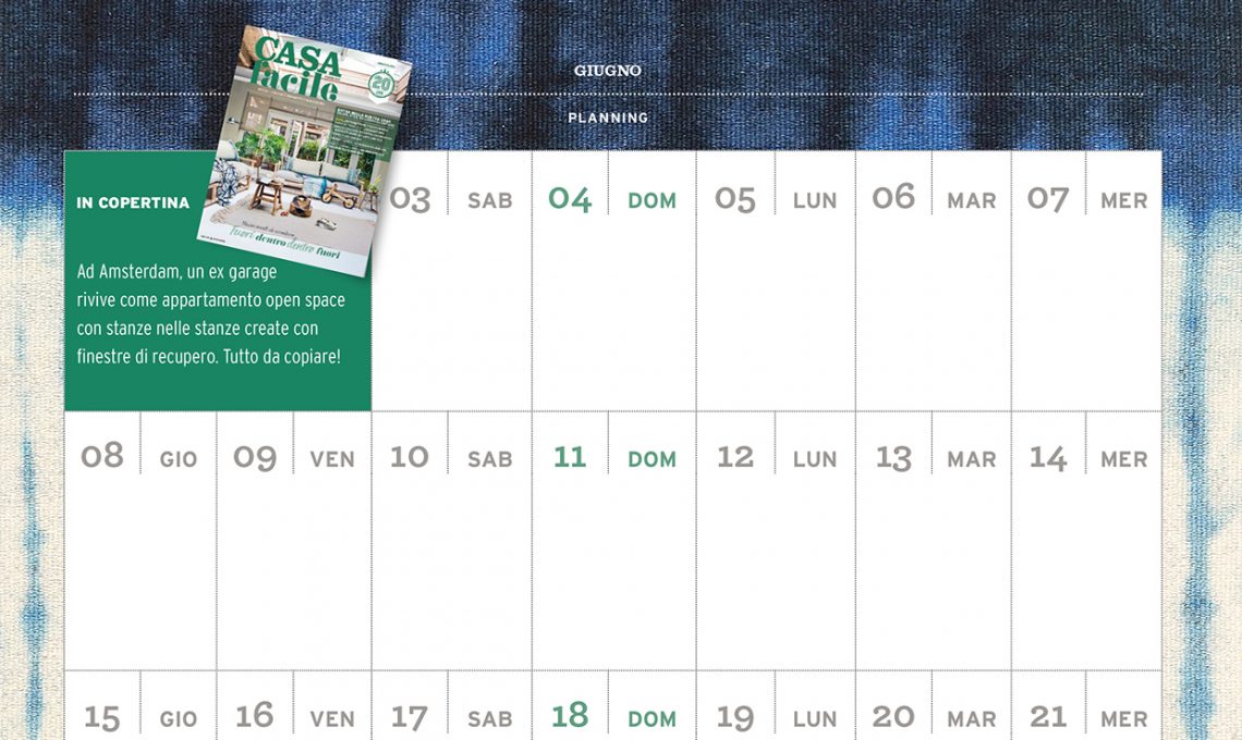 Ah, naturalmente se vuoi sapere quali appuntamenti non dovresti perdere secondo noi, su CasaFacile in edicola dal 6 giugno 2017 trovi la pagina 'al completo'!