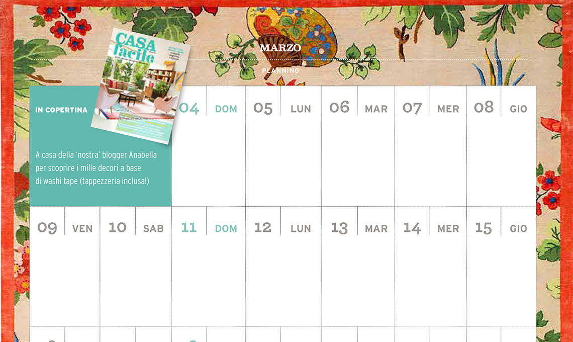Ah, naturalmente se vuoi sapere quali appuntamenti non dovresti perdere secondo noi, su CasaFacile in edicola dal 6 marzo 2018 trovi la pagina 'al completo'!