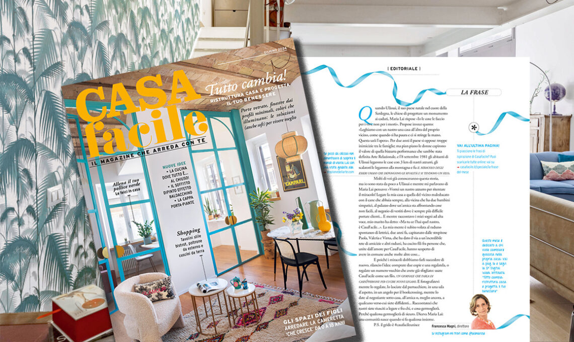 E poiché i miracoli dobbiamo farli succedere di nuovo, rilancio l’idea: comprate due copie e una regalatela, o regalate un numero vecchio che avete già sfogliato: usate CasaFacile come un filo, un giornale che parla di case&persone per cucire nuovi legami. E fotografatevi mentre lo regalate, lo lasciate dal parrucchiere, in una sala d’aspetto, in un angolo per il bookcrossing, mentre lo date al negoziante sotto casa, all’amica o, meglio ancora, a qualcuno verso cui siete diffidenti... Raccontateci che nastri siete riusciti a legare e fra chi, e cosa germoglierà. Perché qualcosa germoglierà di sicuro. Diceva Maria Lai: una comunità nasce quando si fa qualcosa insieme. P.S. il grido è #casafacileunisce