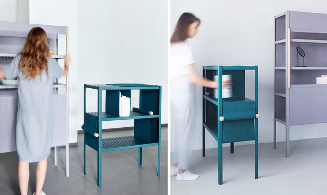 Dressed Cabinet di Puck DiebenArmadi ispirati da un ricordo d’infanzia della designer: i tessuti possono essere usati per “vestire” gli arredi e dar loro la forma desiderata grazie ad un gioco di tensioni date da parti in legno e metallo e che permettono di aprire e chiudere gli spazi.