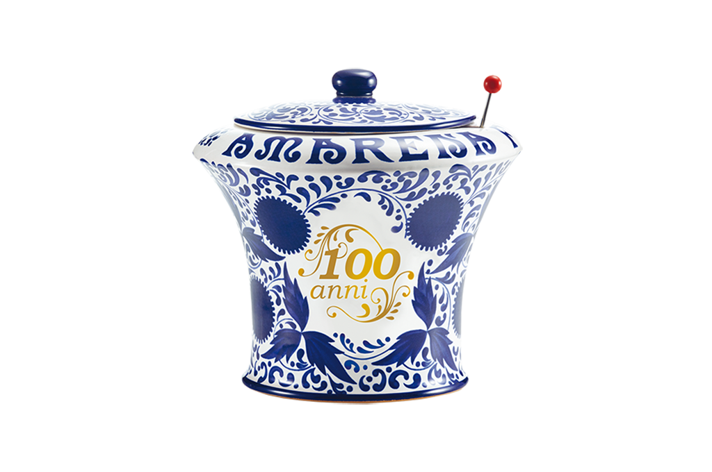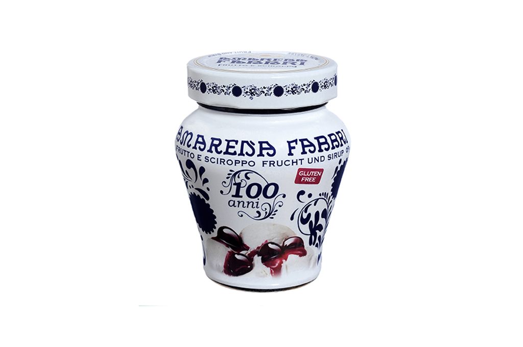 100 anni dopo, la ricetta dell’Amarena Fabbri è ancora la stessa e ha viaggiato molto, con il suo inconfondibile vaso in ceramica dagli arabeschi bianchi e blu commissionato a suo tempo al ceramista Gatti di Faenza.