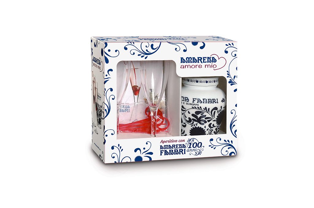Nella confezione è incluso un vasetto di Amarena da 600 grammi, due flûte in policarbonato, sei pungiamarena e un ricettario ricchissimo di idee.