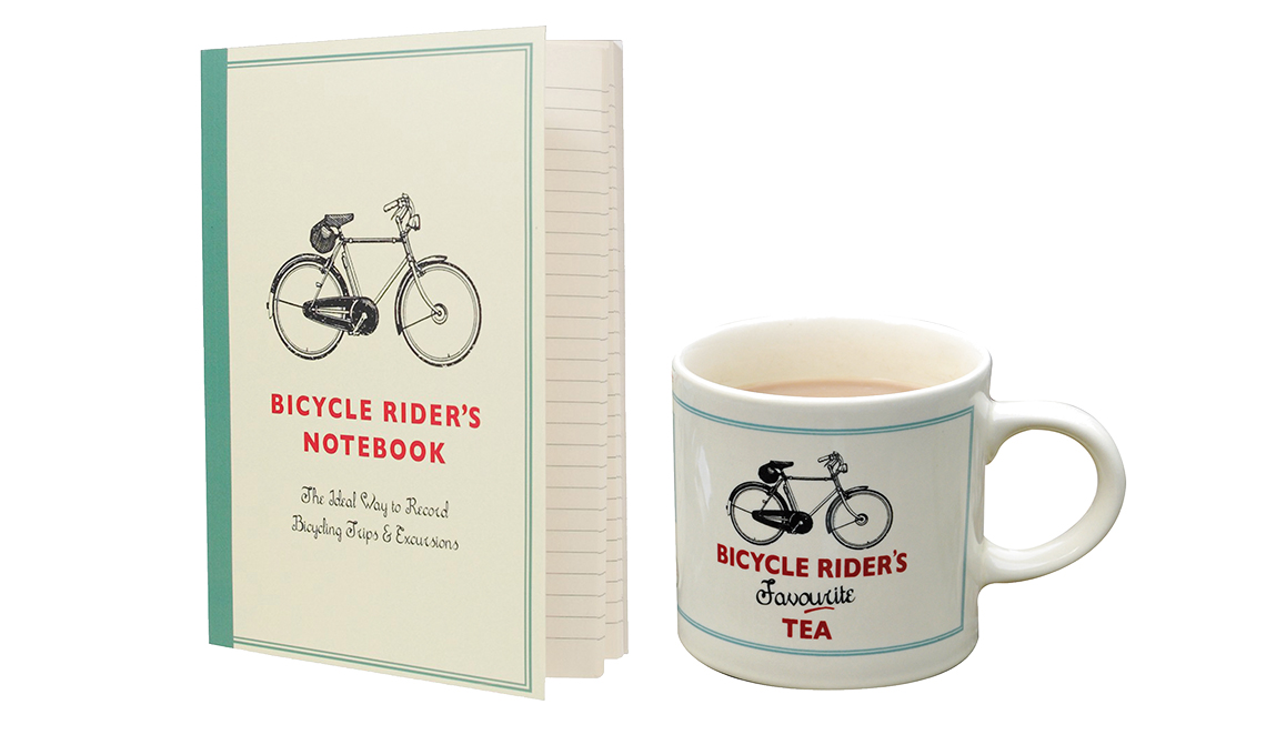 Notebook 13-Bicicletta, per appuntare emozioni e avventure [€12,50] e tazza in ceramica da vero biker [€19], per sorseggiare una bevanda calda [entrambi Maiuguali].