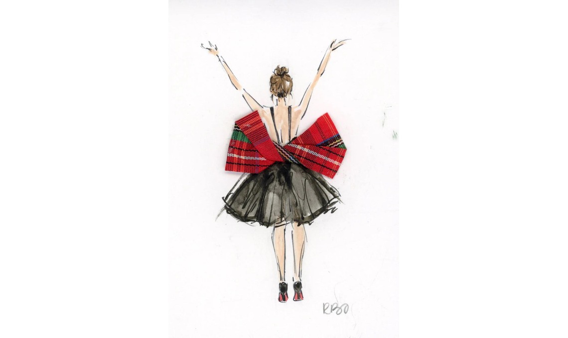 2. Acquerello su carta con applicazione in tessuto nell’opera Tartan Bow [Riley Sheehey, cm 9x13].