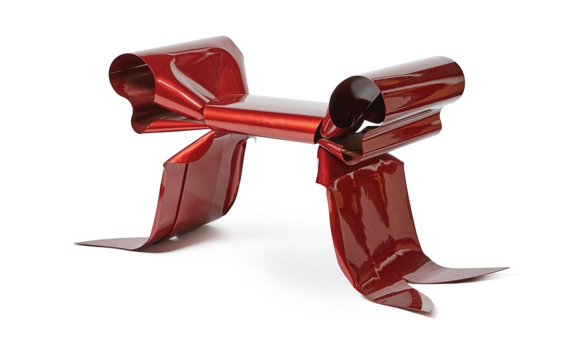 1. In edizione limitata la scultorea seduta in acciaio smaltato Ribbon Pouf di Maria Pergay [Demisch Danant, cm 111x44x55h].