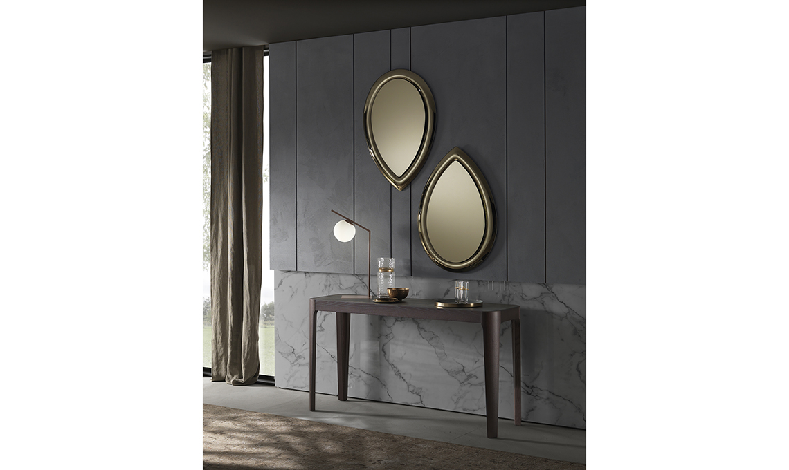 - Petalo è uno degli specchi più semplici e allo stesso tempo scenografici di Riflessi: disegnato da Luca Roccadadria, ha una forma a goccia con una particolare cornice specchiante in cristallo.