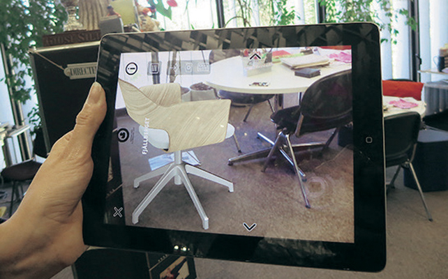 3) Ora allontanati lentamente dal giornale. È importante mantenere la fotocamera sempre puntata verso la pagina di CasaFacile. Quando vedi comparire l’oggetto nelle dimensioni corrette, fermati. Sembra incredibile: la poltroncina di Ikea in realtà non c’è, ma sul nostro tablet è apparsa proprio intorno al tavolo da riunioni del direttore!