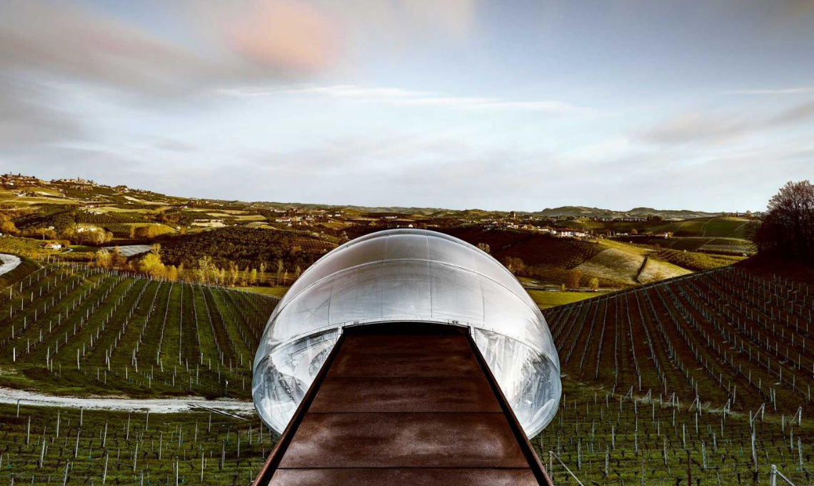 l’Acino, una bolla trasparente pensata per eventi e degustazioni d’eccellenza sospesa sul paesaggio di Langa. La struttura è in dialogo con