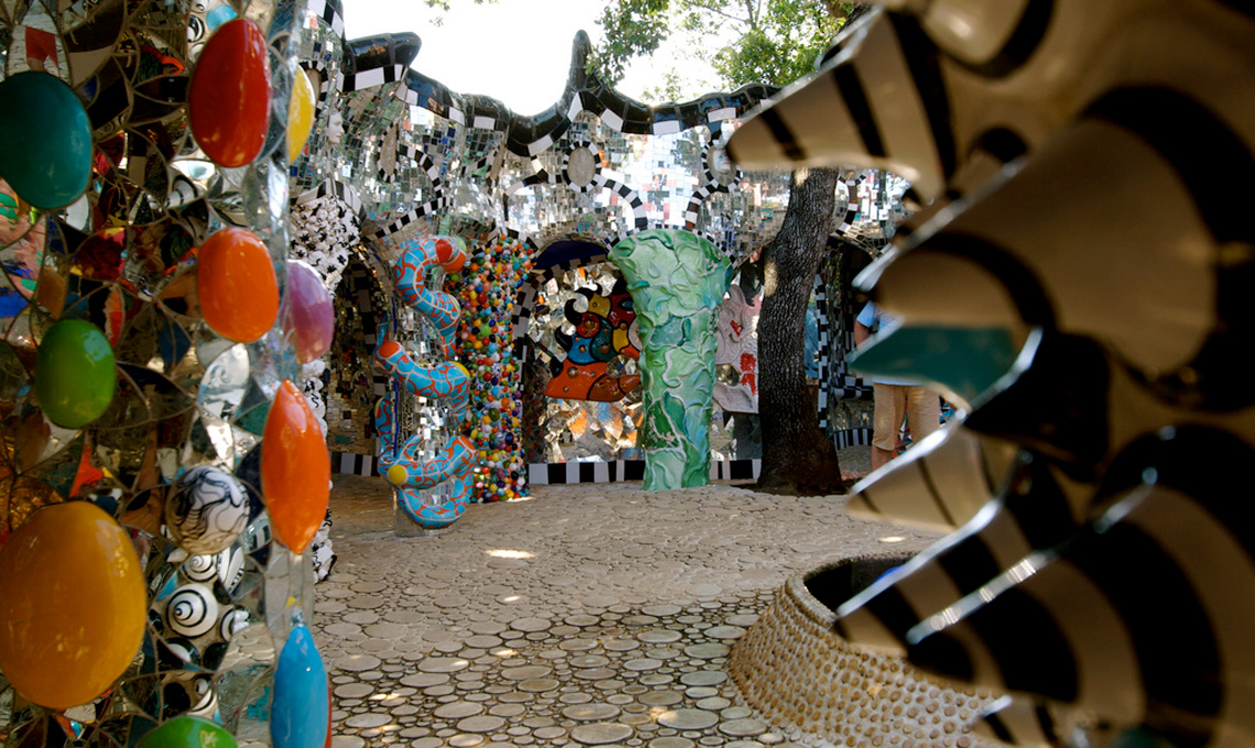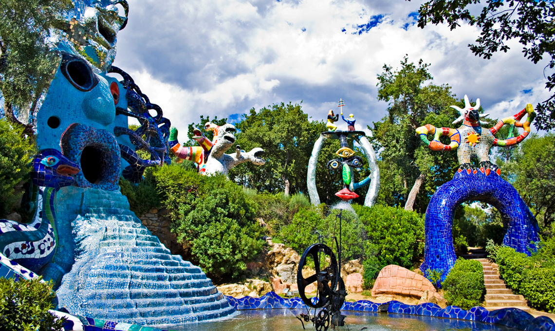 Un’artista franco-americana, Niki de Saint Phalle, ha popolato questo giardino con statue dedicate alle figure degli arcani maggiori dei tarocchi: ispirandosi al Parque Guell di Antoni Gaudí a Barcellona, nel 1979 l’artista inizia a costruire il giardino, con 22 sculture in acciaio e cemento ricoperte di vetri, specchi e ceramiche colorate.