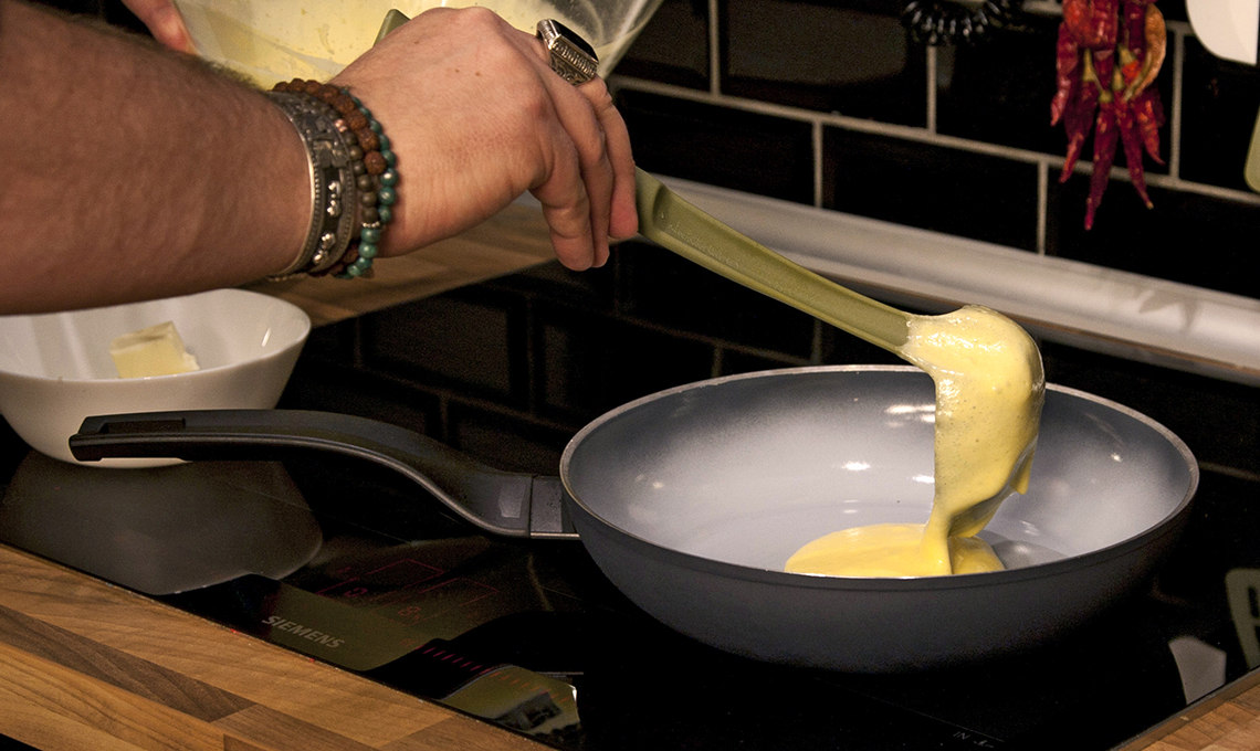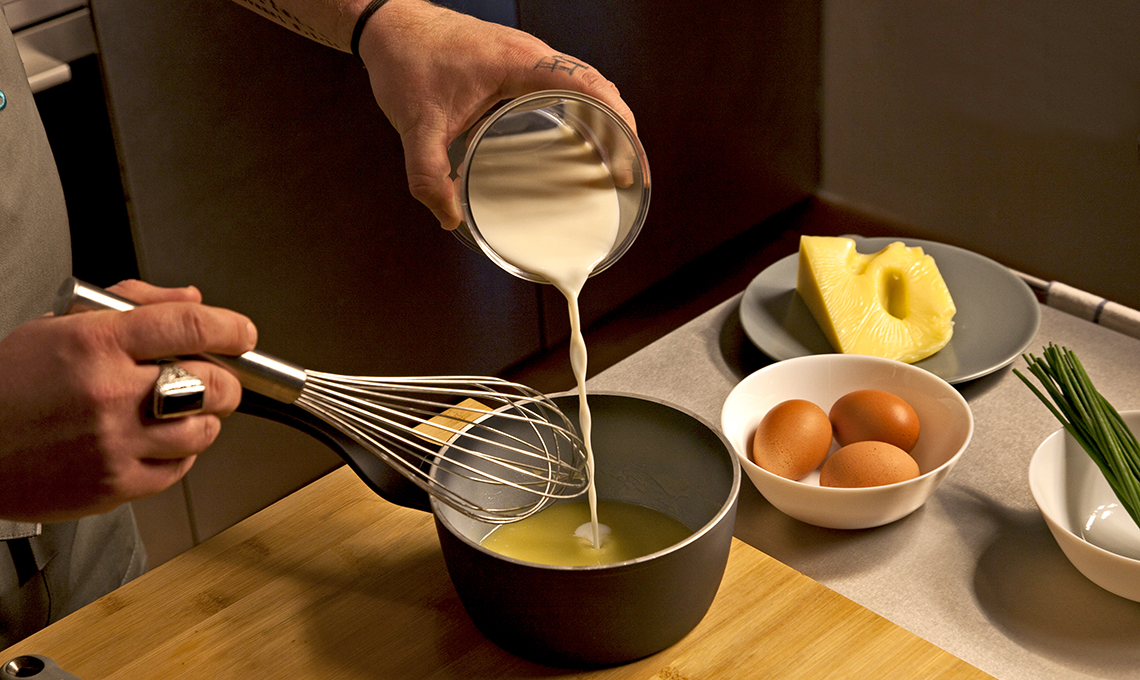 Prepara un roux classico in un tegamino, versa il latte e porta a ebollizione. Aggiungi quindi la Gruyère AOP, il burro e la farina, ed emulsiona con il frullatore a immersione. Una volta tiepida, concludi con aggiunta di crème fraîche.