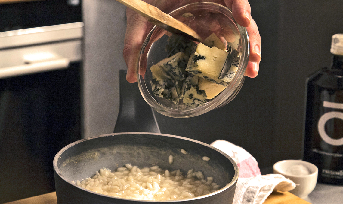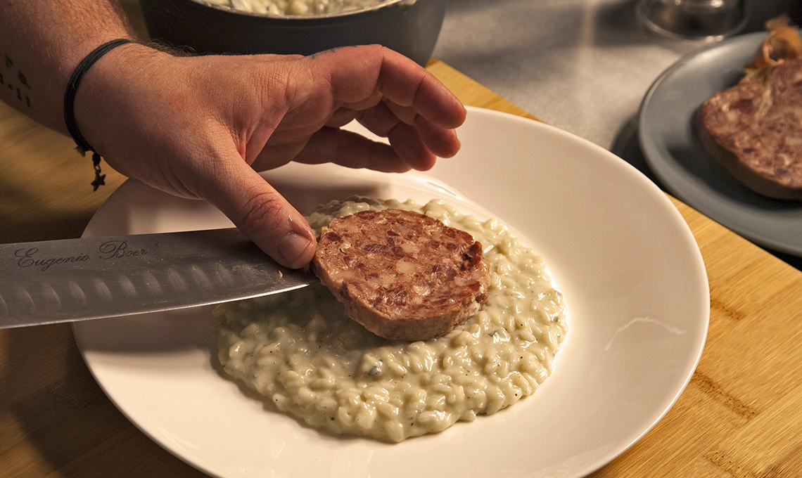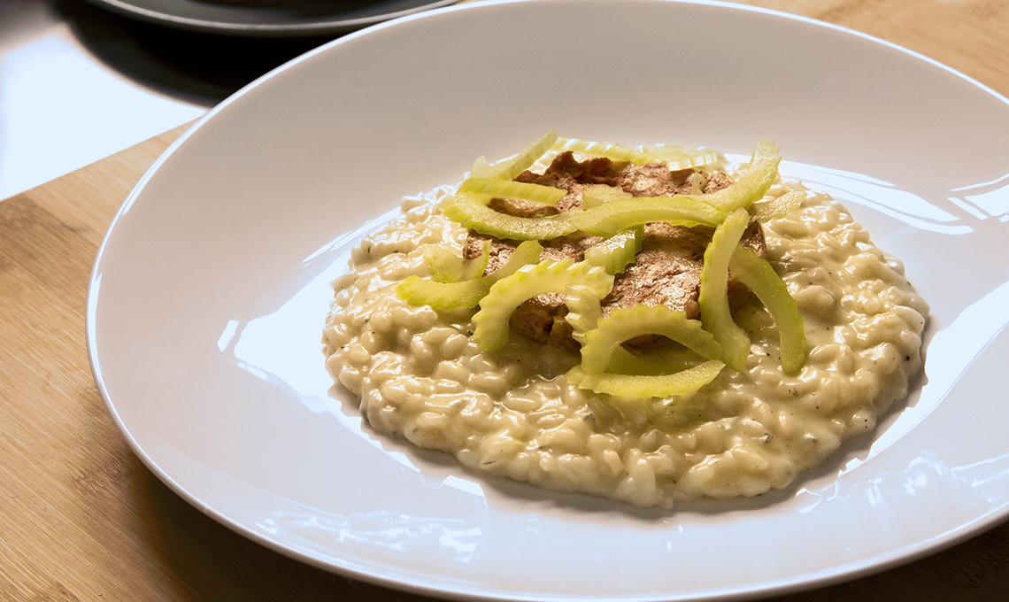 Risotto al gorgonzola piccante, mortadella di fegato e sedano croccante