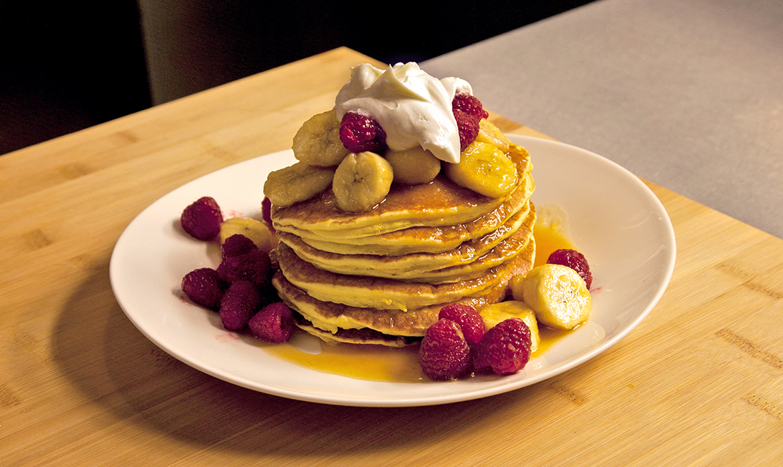 Pancake con sciroppo d'acero, banane e lamponi
