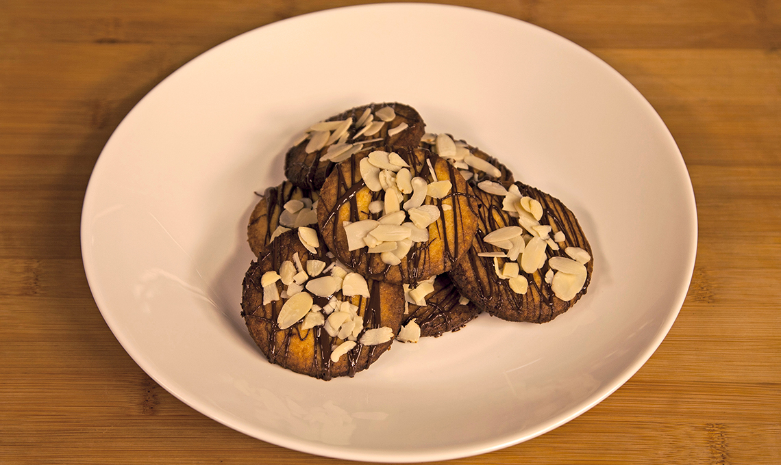 Setaccia la farina 00 con il lievito artificiale in polvere e disponi ad anello. Al suo interno poni burro e zucchero con i tuorli d’uovo e una scorza d’arancia grattugiata. Unisci la farina 00 e impasta velocemente. Stendi l’impasto e taglialo con una forma rotonda. Lascia riposare in frigorifero per almeno 30 minuti. Intanto, taglia finemente il cioccolato e scioglilo a bagnomaria. Cuoci a 220° per 10/15 minuti. Impiatta i biscotti guarnendoli con cioccolato e mandorle.
