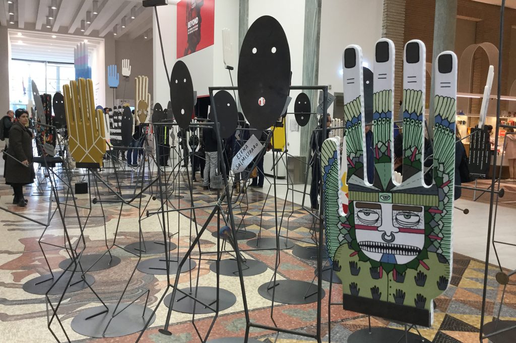 Quindi ogni mano è 'partita' verso i 54 autori che l'hanno rielaborata alla loro maniera: così sono state create le mani che vedi da quella di Paladino trafitta da un proiettile che lascia un'ombra d'oro a quelle eteree per l'estrema vecchiaia di