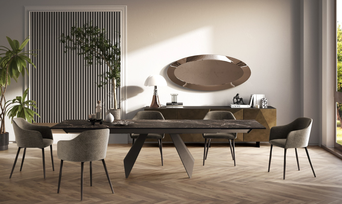 Completano l’ambiente la madia Diamond (L.240 cm) e la specchiera Eye Bronzo. Misura tavolo: 200x100 cm, allungabile a 290 cm