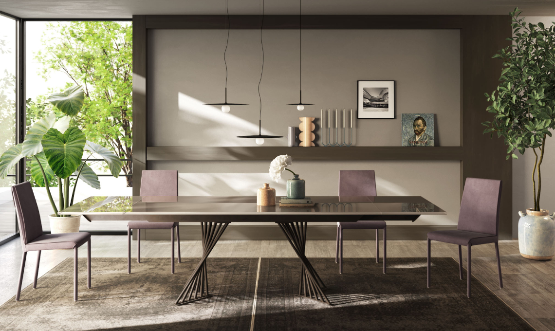 Nella foto, tavolo Paris di Scavolini presentato in configurazione allungabile con aperture laterali: struttura in metallo verniciato Bronzo e piano in vetro lucido Visone SCAV 856_V. In abbinamento sedie Blazer con rivestimento in tessuto Ares 01. Misura tavolo: 200x100 cm, allungabile a 290 cm.