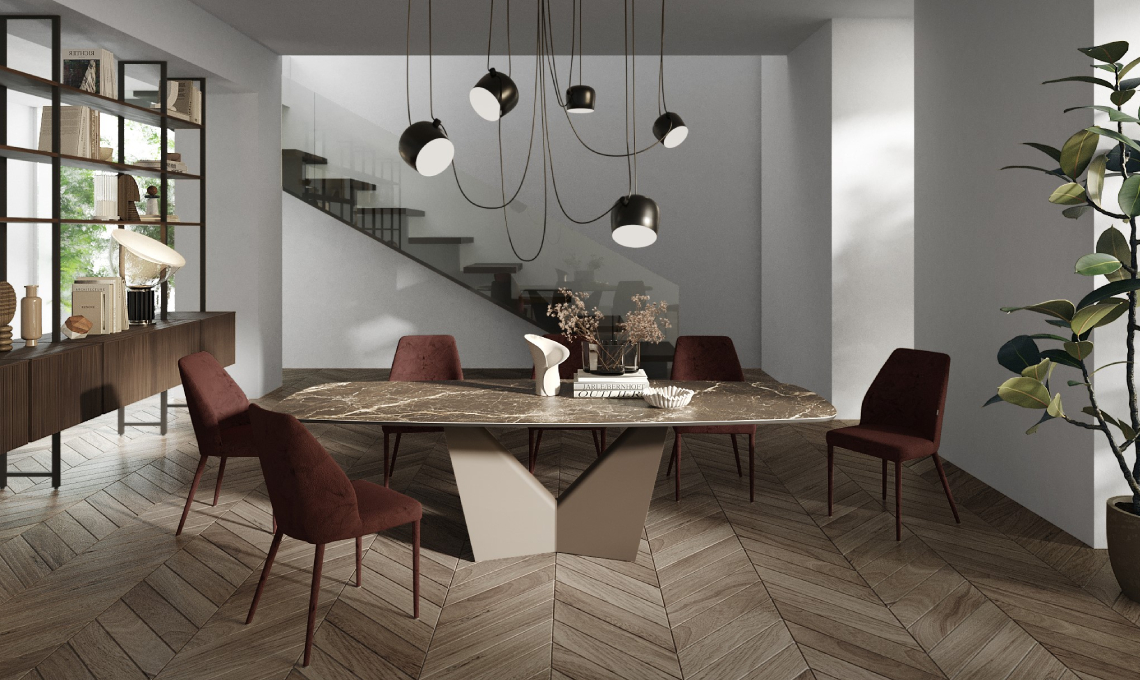 Nella foto, tavolo Luxor di Scavolini presentato in configurazione allungabile con aperture laterali: struttura in metallo verniciato Bronzo e piano Abitum Marmo Brown Rigato finitura Strutturata. In abbinamento, sedia Fifties con gambe in metallo verniciato Bronzo, seduta e schienale rivestiti in tessuto Viki/Viki TS 09.