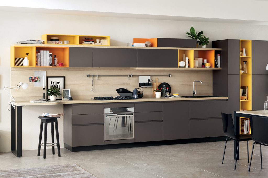 FoodShelf nell'abbinamento delle squillanti tinte Giallo Genziana e Arancio Nantese con ante in Grigio Terra.