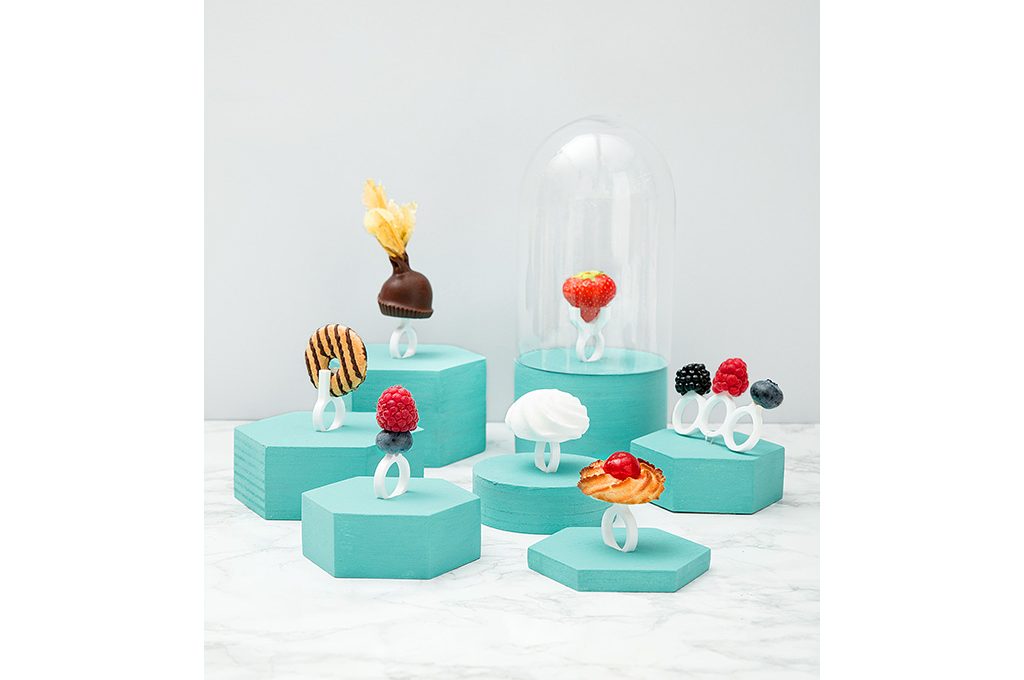Bocconcini e stuzzichini presentati su anelli in plastica tagliata al laser: un modo divertente e nuovo per mangiare con le mani senza sporcarsi le dita! Un aperitivo divertente che ha trasformato un gesto semplice in un gioco.