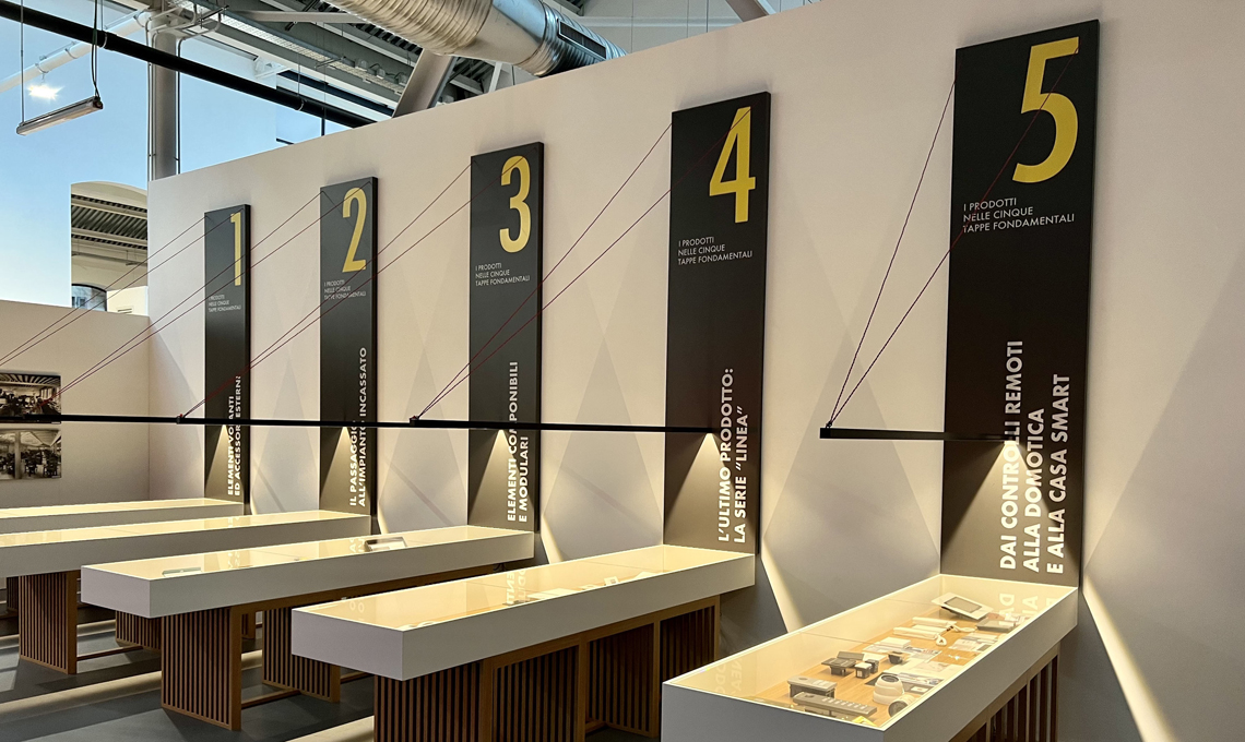 In mostra gli oggetti dell’elettricità di quasi ottant’anni di storia dell’azienda e della casa, dagli accessori volanti ai portalampada, agli elementi pensati per gli impianti integrati nei muri; la componibilità e la modularità degli oggetti elettrici, dai telai alle cornici, ai comandi integrati, fino alla casa domotica.