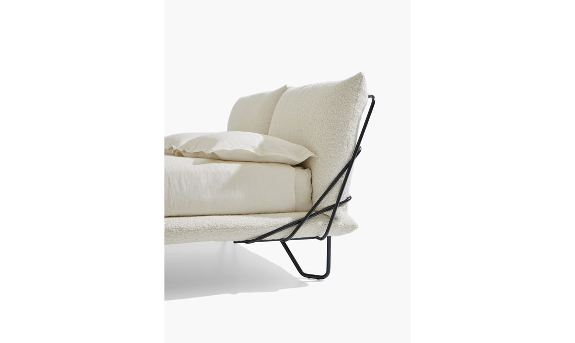 Letto sfoderabile Zenit [Alto], design N Lab, rivestimento in tessuto Natural Bouclè 01. Piedi in metallo nero realizzati in abbinamento alla struttura.