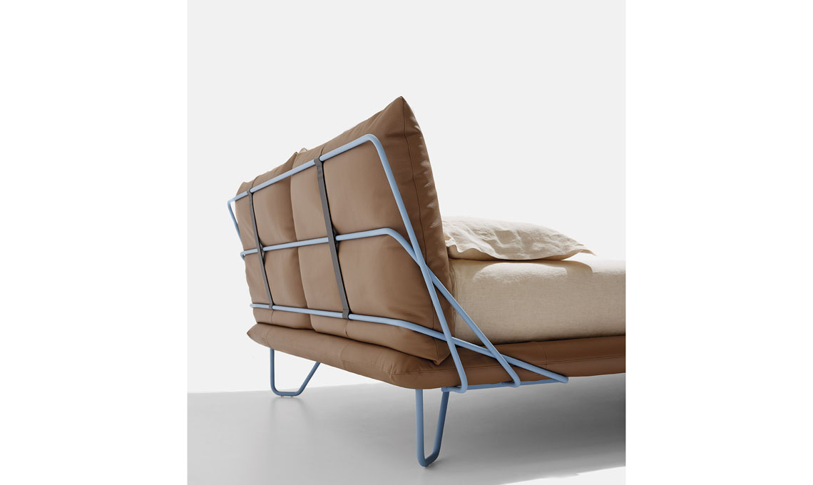 Letto sfoderabile Zenit [Alto], design N Lab, rivestimento in pelle Levante 211. Piedi in metallo colorazione Pantone14-4508 realizzati in abbinamento alla struttura.