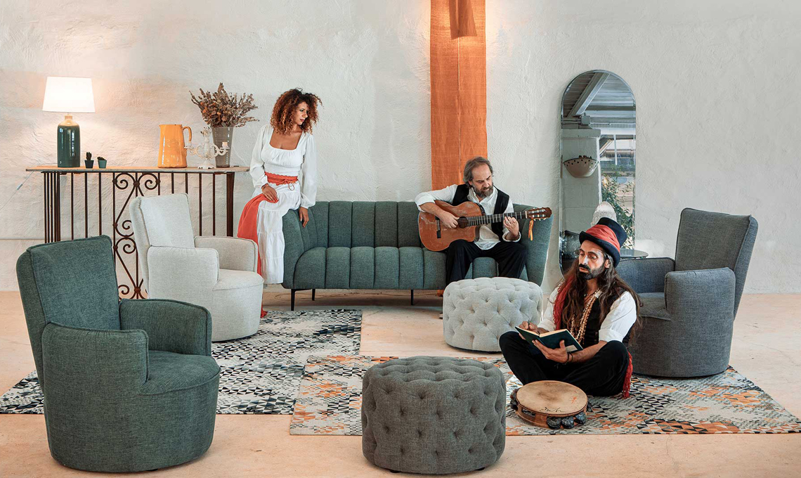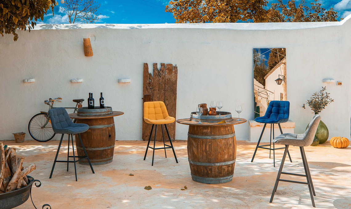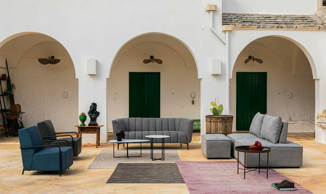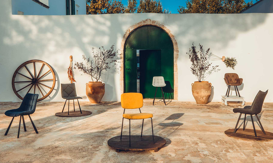 Nelle foto in alto puoi vedere le poltrone Caroline con poggiapiedi, il tavolino Chris, i tappeti Esopo e altri prodotti ambientati in una masseria: la Puglia diventa la musa ispiratrice di una nuova storia di luci, colori e vibrazioni.