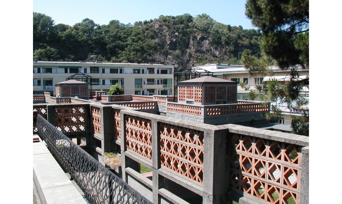 Scuola materna in Canton Vesco a Ivrea. Vista delle terrazze, con le caratteristiche murature in pietra e i parapetti in cotto. [Courtesy “Architetture olivettiane a Ivrea - I luoghi della residenza e i servizi per
