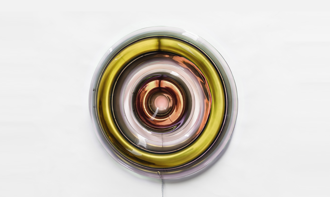 Le lampade da parete Joy sono tonde e super colorate: la resina, lavorata a strati, svela le sue infinite sfumature e si accende con la luce del neon, per un effetto pop e quasi psichedelico.