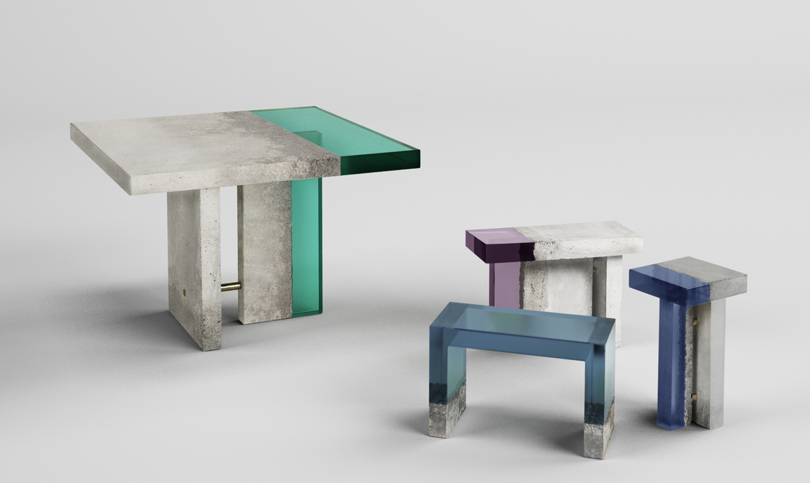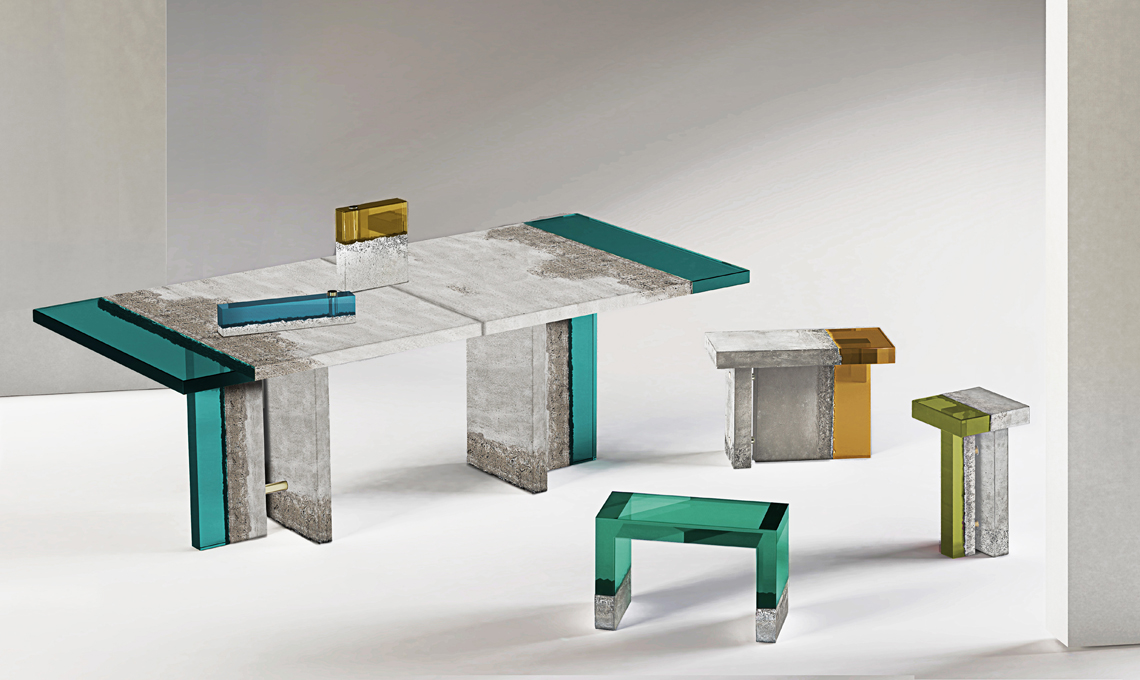 Il tavolo da pranzo Golia è ispirato all’estetica neobrutalista, mettendo in contrapposizione la trasparenza della resina colorata e la solidità del cemento lavorato in superficie con il sale marino che rende viva la materia accentuandone la ruvidezza.
