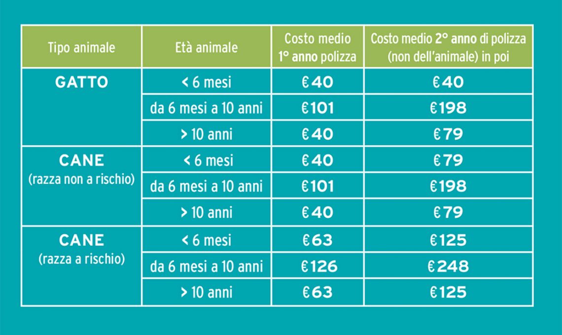 La risposta varia in base a razza ed età dell’animale. Il primo parametro è quantificato secondo a specifiche tabelle che dividono i cani (soltanto loro) tra razze a rischio e razze non a rischio: assicurare le prime, ovvio, costa qualcosa in più. Per il secondo parametro (l’età) ci si basa invece su tre fasce, stavolta valide anche per i gatti: la prima considera i cuccioli (meno di 6 mesi); la seconda gli animali in età adulta (dai 6 mesi ai 10 anni); l’ultima quelli anziani (oltre i 10 anni).